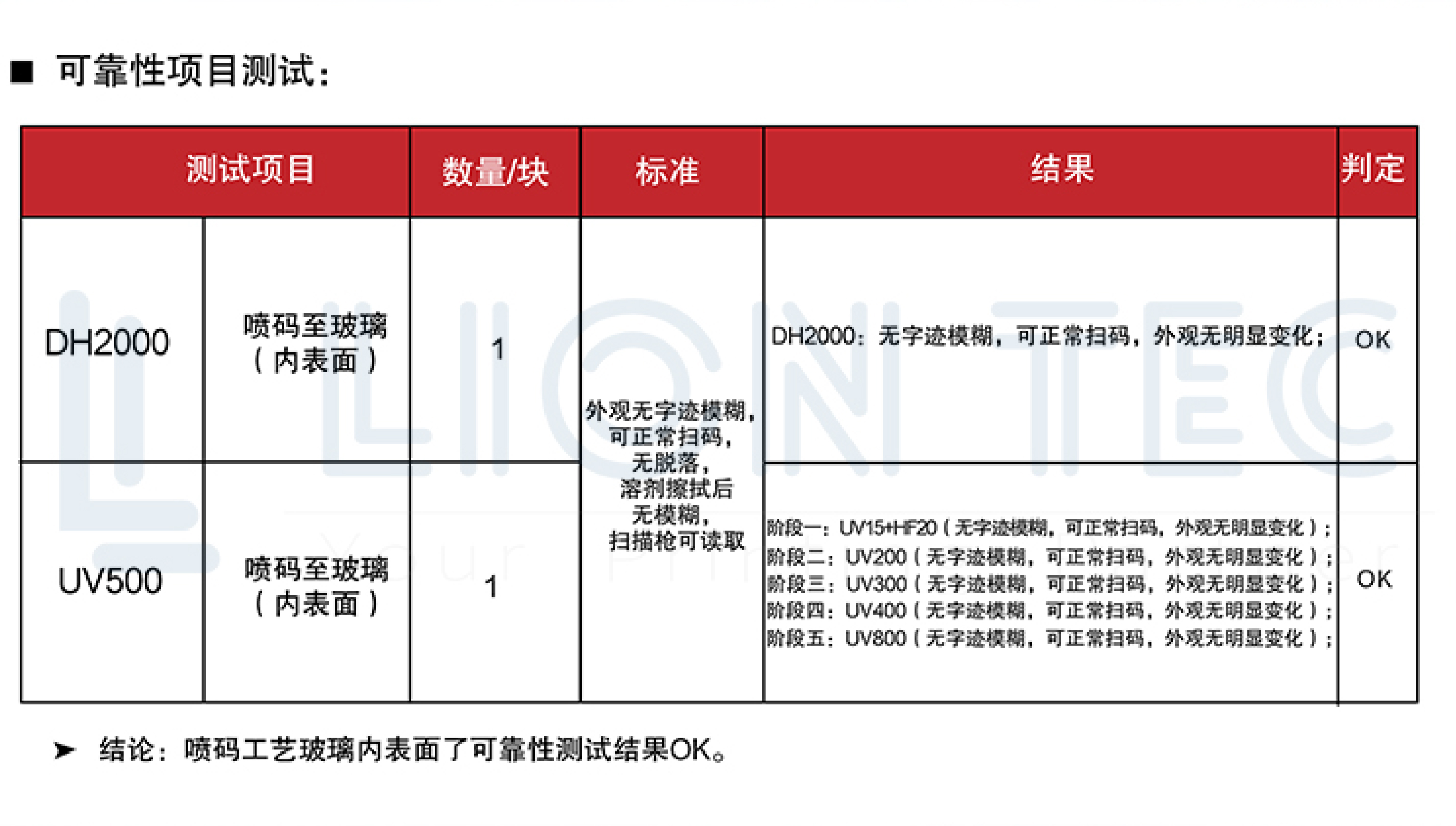 每一塊噴碼玻璃均通過DH2000濕熱老化試驗(yàn)及UV500紫外耐候試驗(yàn),確保在高濕、高熱、高紫外環(huán)境下仍具備高附著、高識(shí)別度、不脫落、不模糊等性能表現(xiàn)。